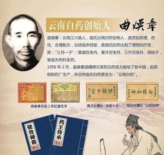 曲焕章的童年经历坎坷,9岁两人中,父母双亡,他和妹妹终生相依为命。姐姐结婚后,曲焕章就跟着姐夫学医。曲焕章不是学医最有天赋的,但他确实是最勤奋的。他效法神农,尝遍药材,虚心请教民间医生。曲焕章经过十多年的潜心研究,终于发明了一种治疗刀枪伤效果极佳的八宝丸,也就是云南白药。